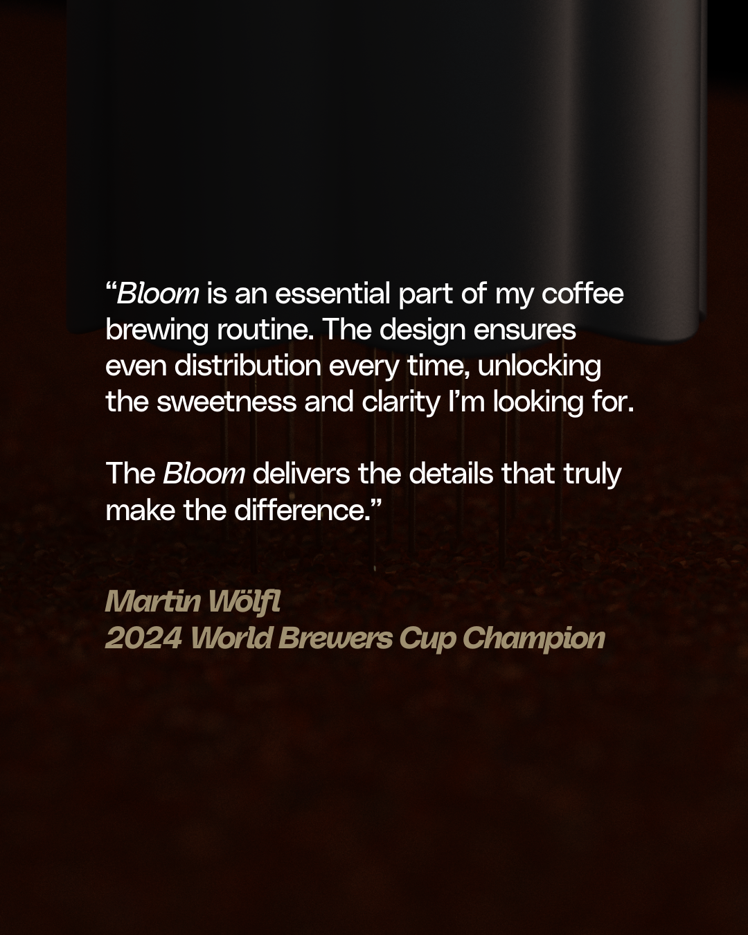 “Bloom is an essential part of my coffee brewing routine. The design ensures even distribution every time, unlocking the sweetness and clarity I’m looking for. The Bloom delivers the details that truly make the difference.”