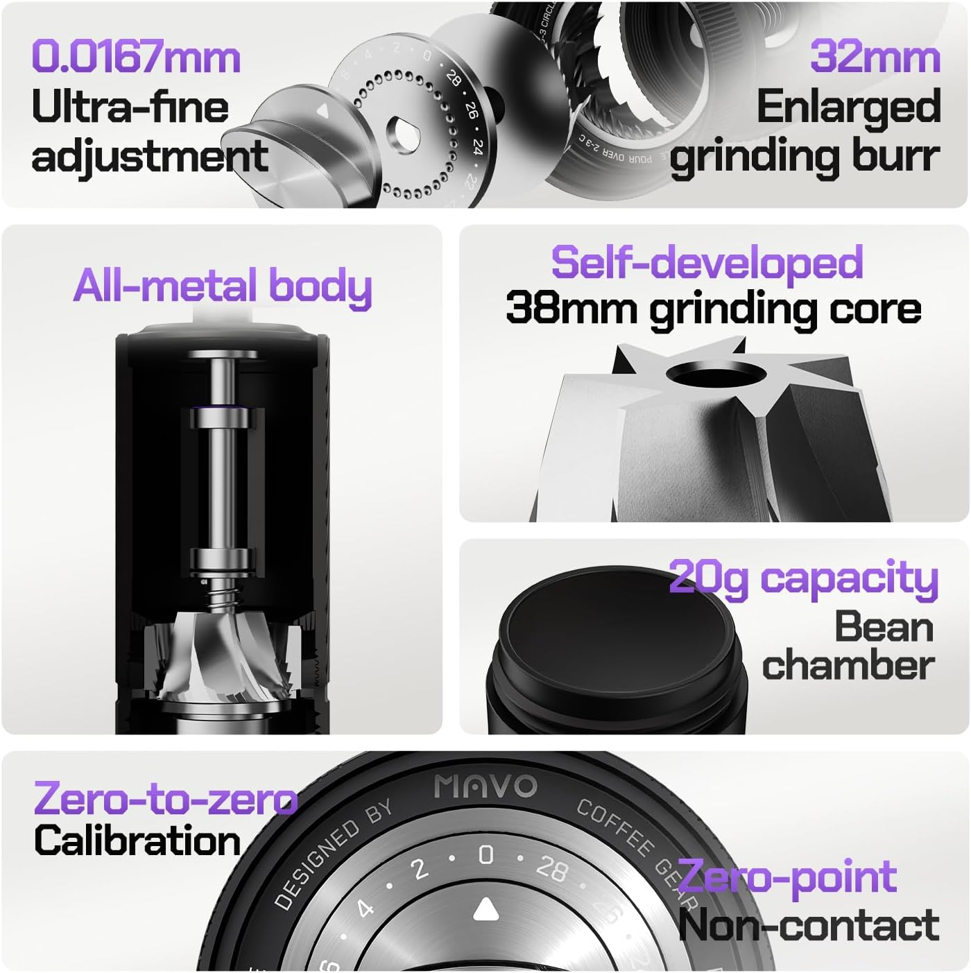 - Excellent Grindability - The manual burr coffee grinder milling blade is made of 55-58 HRC hardness, which is machined by 5-axis CNC for uniform grinding with virtually no overly coarse particles and the generation of fine powder is minimized. Adoption of μ-grade precision fine grinding of the large axis has resulted in a significant increase in the precision of the center axis.